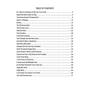 Fifty of the most popular and best-loved Christmas pieces of all time. Titles: All I Want for Christmas Is My Two Front Teeth * Angels We Have Heard on High * The Annual Animal Christmas Ball * Away in a Manger * Believe * The Christmas Waltz * The Coventry Carol * Deck the Hall * The First Noel * Frosty the Snowman * The Fruitcake That Ate New Jersey * God Rest Ye Merry, Gentlemen * Good King Wenceslas * Grandma Got Run Over by a Reindeer * Hark the Herald Angels Sing * Have Yourself a Merry Little Christmas * I Saw Three Ships * I'll Be Home for Christmas * It Came Upon the Midnight Clear * It's the Most Wonderful Time of the Year * Jingle Bell Rock * Jingle Bells * Let It Snow! Let It Snow! Let It Snow! * The Little Drummer Boy * Merry Christislamakwanzakah! * Mistletoe and Holly * Nuttin' for Christmas * O Christmas Tree * O Come, All Ye Faithful * O Come, O Come, Emmanuel * O Holy Night * O Little Town of Bethlehem * Santa Claus Is Comin' to Town * Santa Claus on de Coconut Tree * Silent Night * Sleigh Ride * Suzy Snowflake * There Is No Christmas Like a Home Christmas * (There's No Place Like) Home for the Holidays * These Are the Special Times * Thirty-Two Feet and Eight Little Tails * Toyland * The Twelve Days of Christmas * The Twelve Pounds of Christmas * Up on the Housetop * We Three Kings of Orient Are * We Wish You a Merry Christmas * What Child Is This? (Greensleeves) * Winter Wonderland * You're a Mean One, Mr. Grinch.